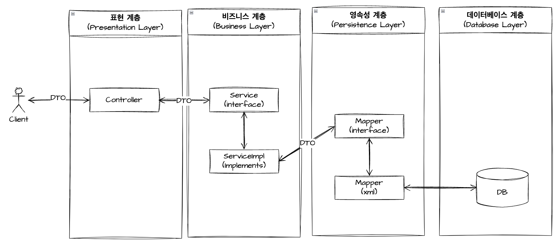 - Client → Presentation Layer → Business Layer → Persistence Layer → Database Layer