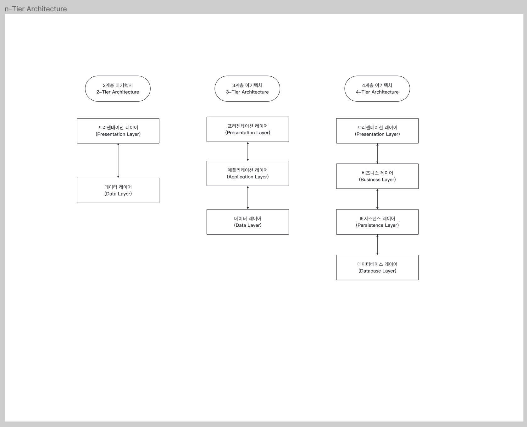- 다중 계층 아키텍처라고도 하며 N계층 아키텍처는 둘 이상의 계층을 갖는 애플리케이션 아키텍처를 의미합니다.