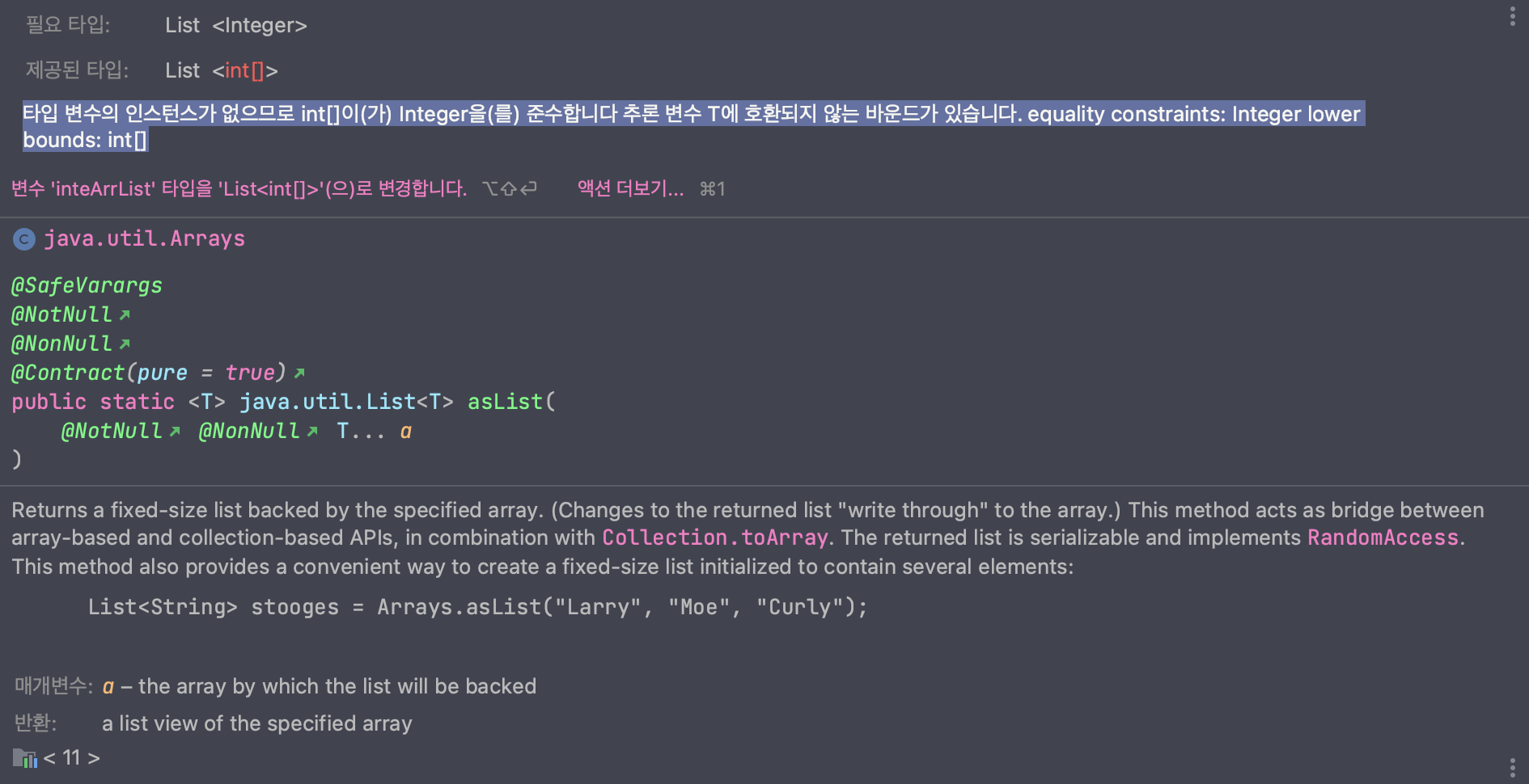 [참고] 기본 자료형 Array to List 에러 발생 및 해결 방법 : int[] to List<Integer>
