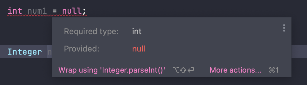 int num1 = null; // Wrap using 'Integer.parseInt()'