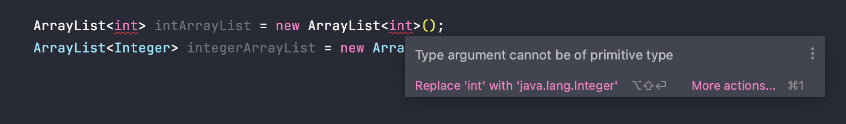 ArrayList<int> intArrayList = new ArrayList<int>(); // replace 'int' with 'java.lang.Integer'