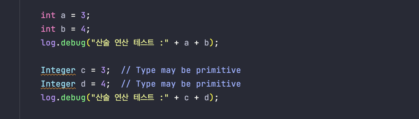💡 기본 자료형(int)는 숫자의 산술연산이 가능하지만 래퍼 클래스(Integer)의 경우는 산술연산이 불가능합니다.