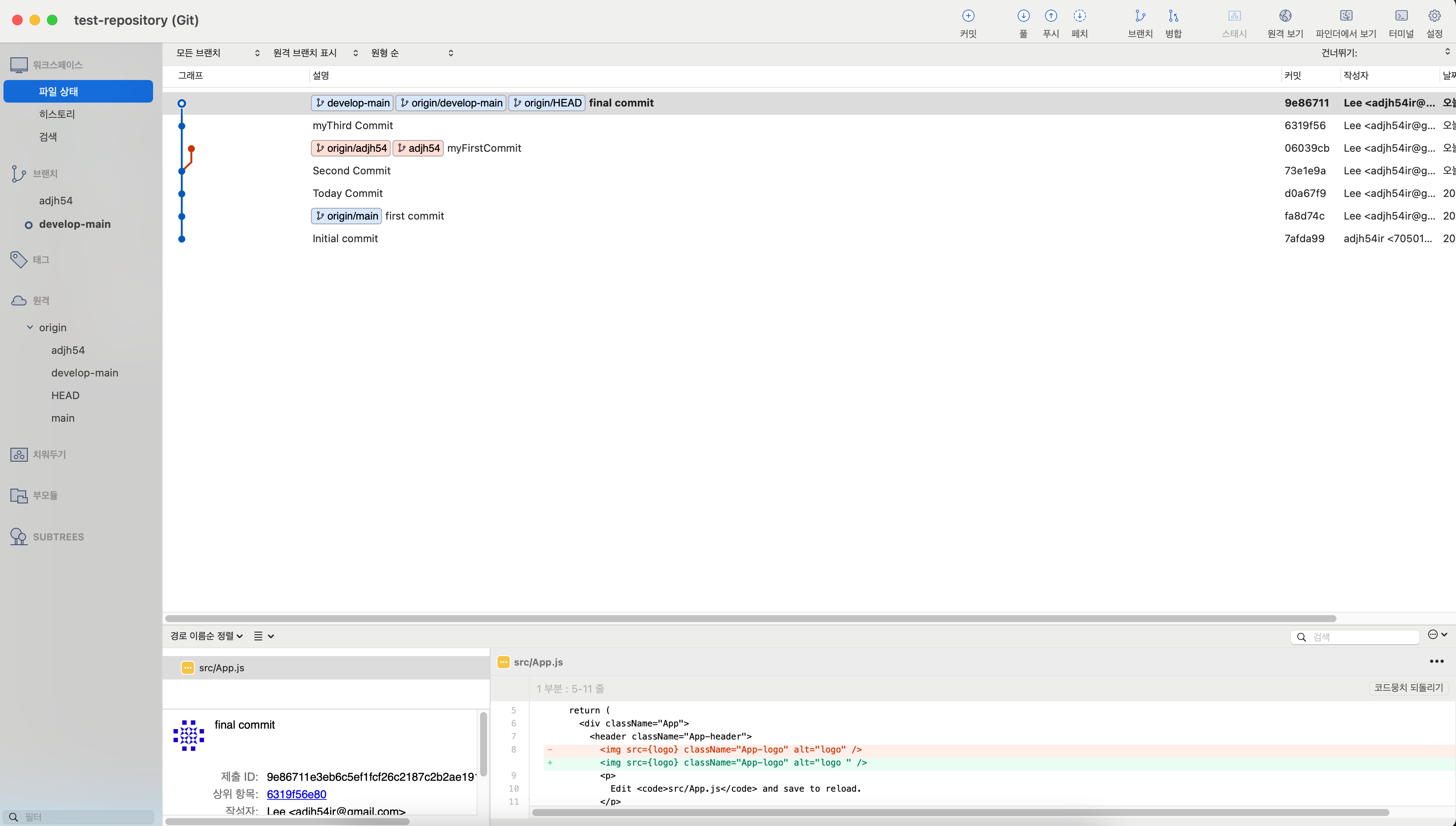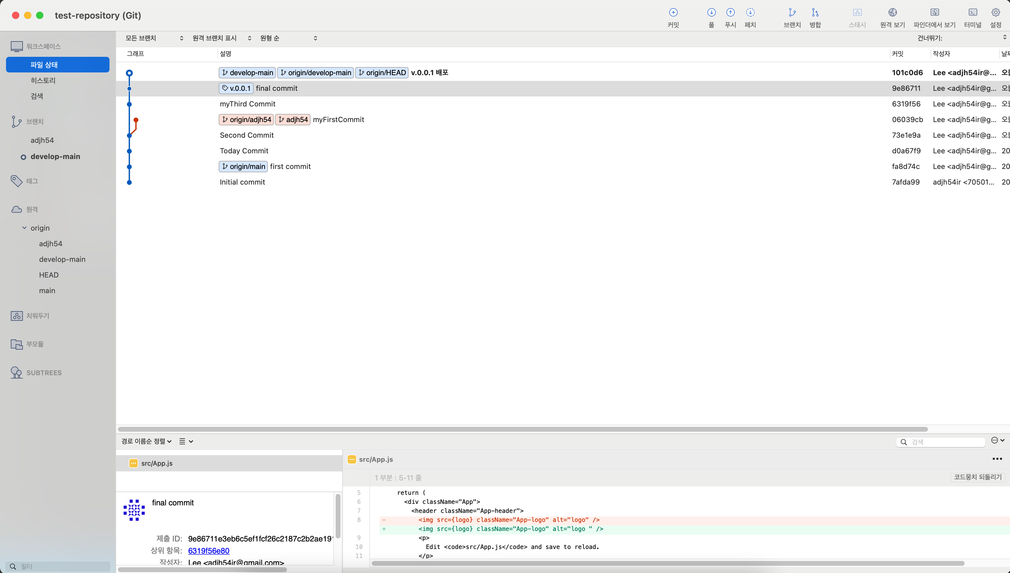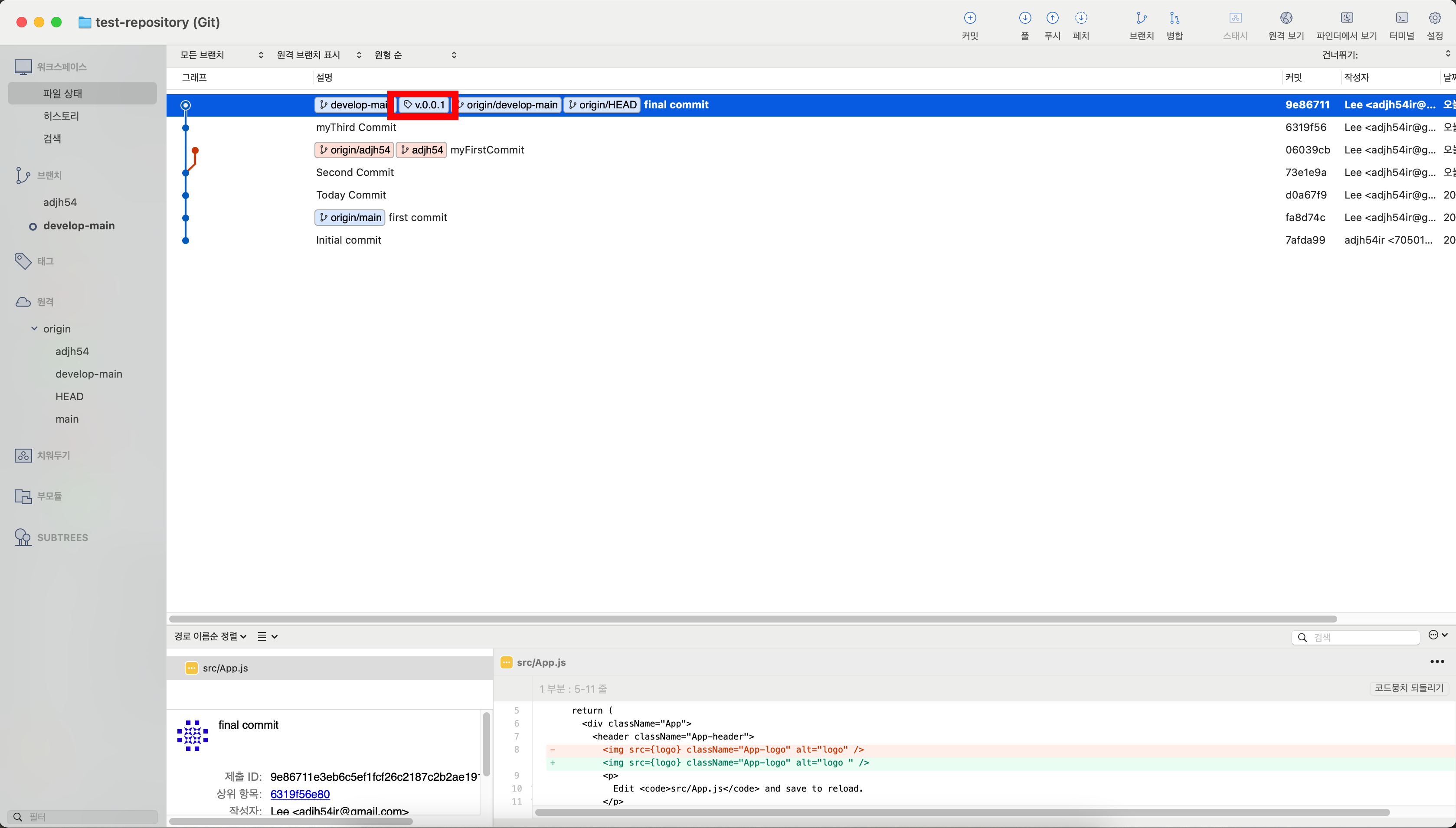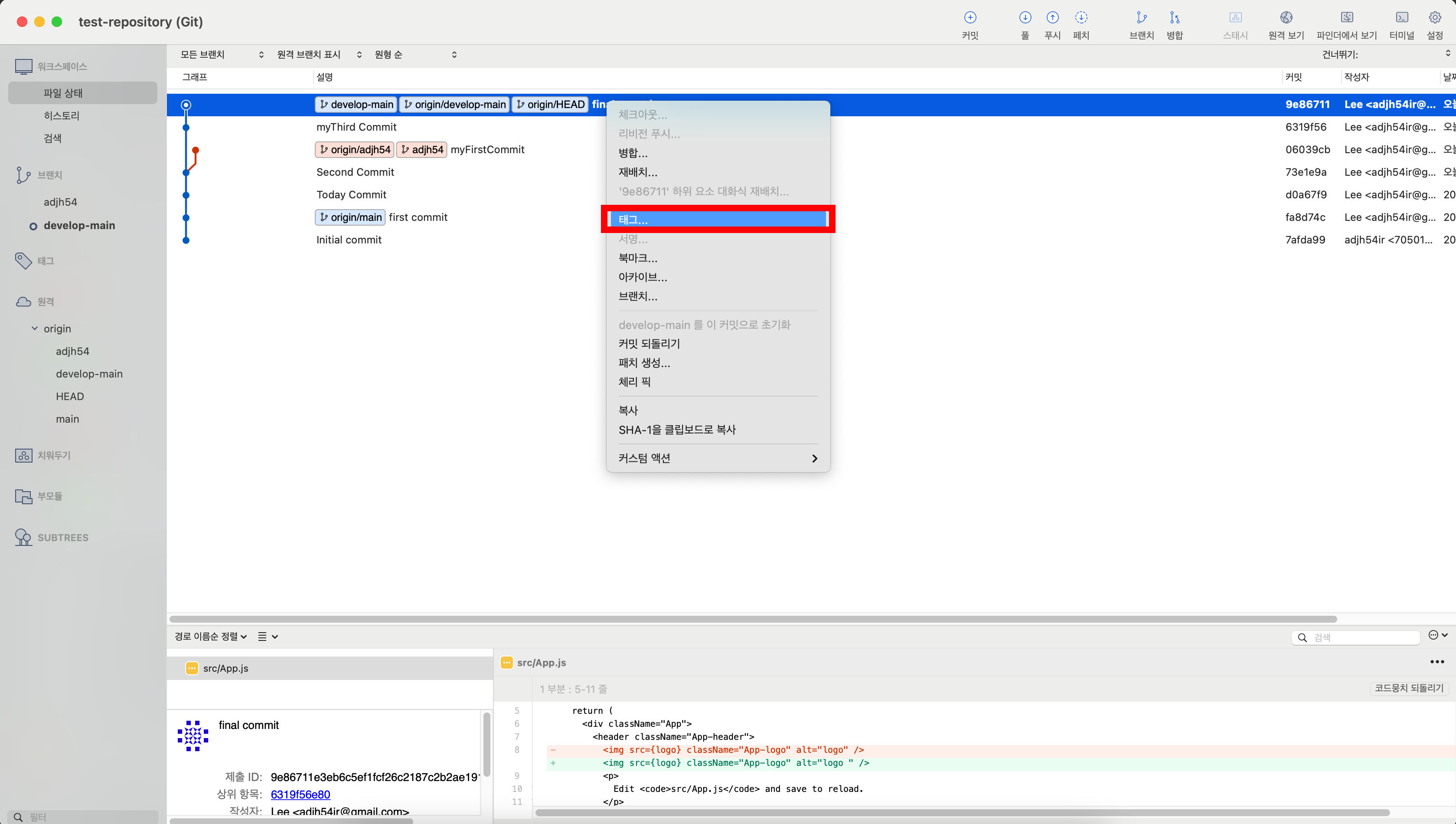 6. [Sourcetree] 태그를 생성한 브런치에 한번 더 커밋 & 푸시를 수행합니다
