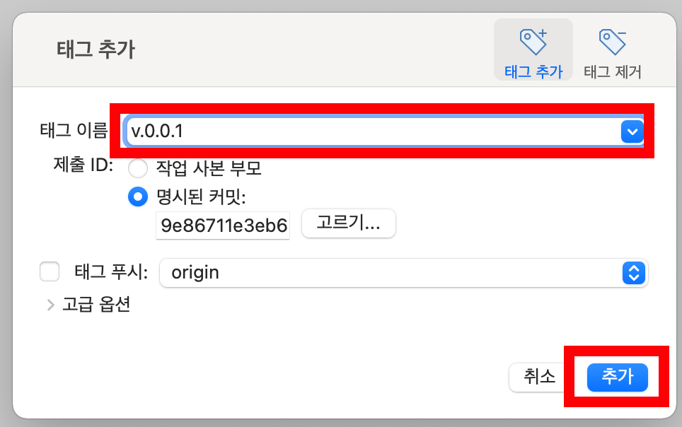 3. [Sourcetree] 태그 추가 팝업이 출력되며, 태그 이름을 입력하고 ‘추가 버튼을 누릅니다.