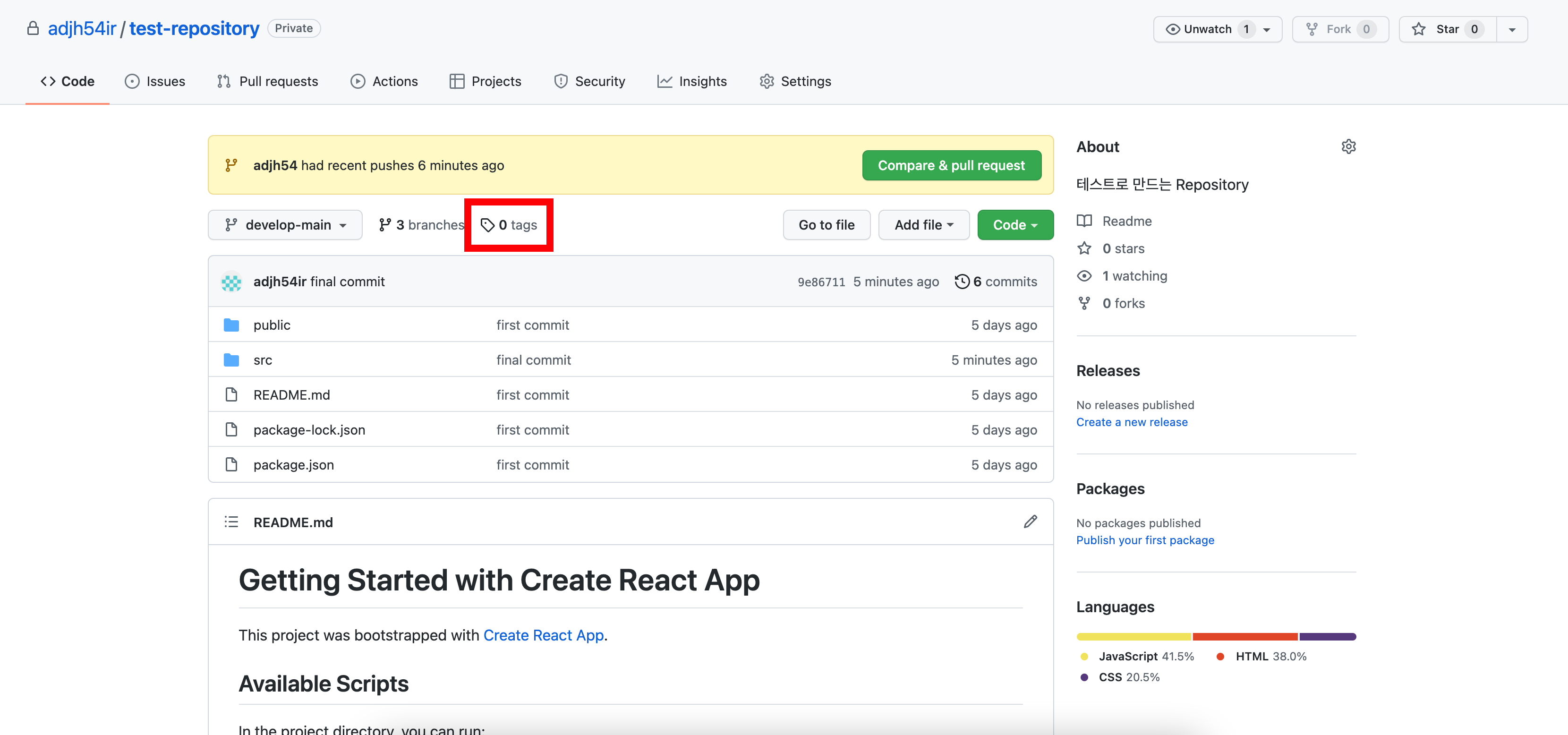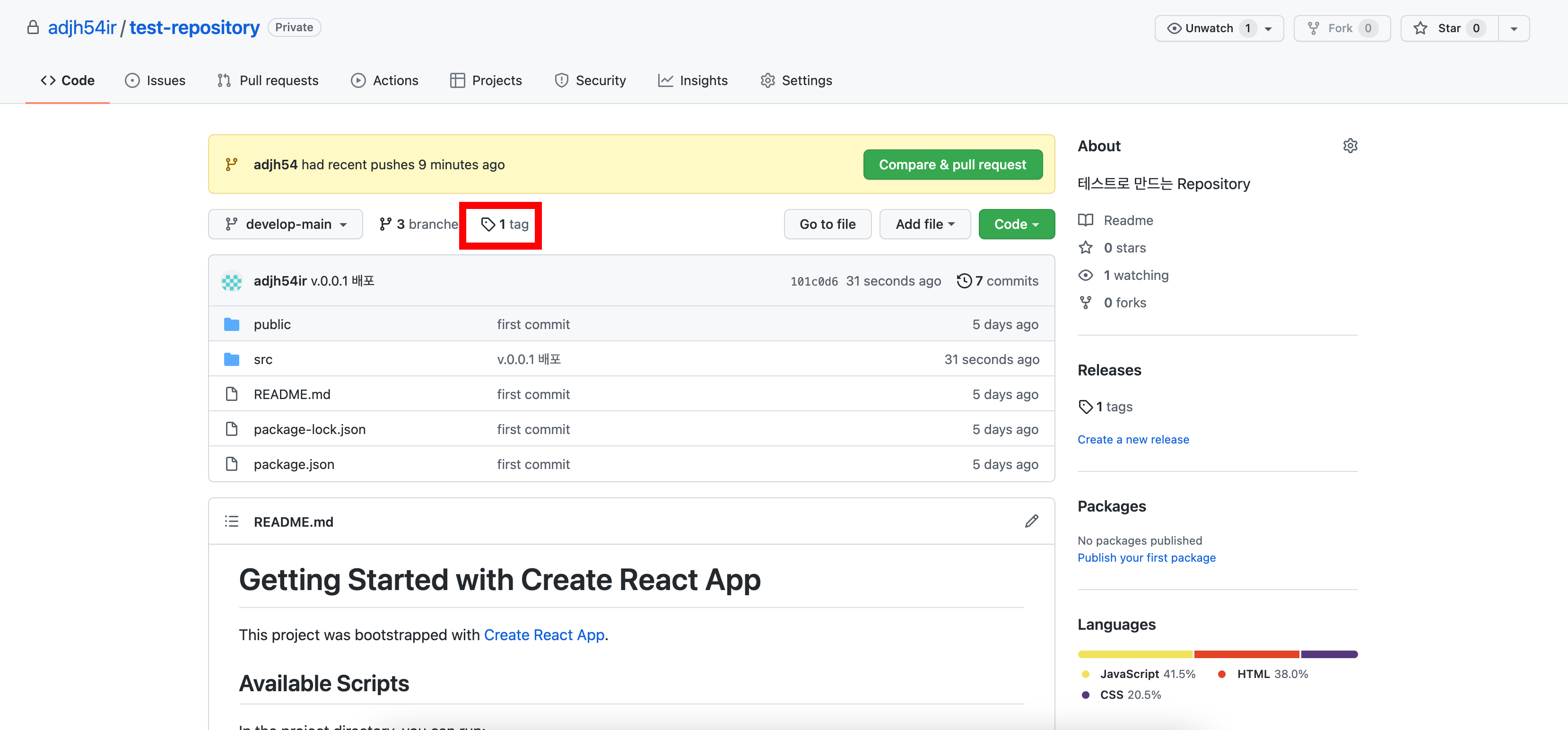 해당 브런치에 한번 더 커밋 & 푸시가 이루어져야 태그가 확인이 된다는 것을 확인하셔야 합니다.