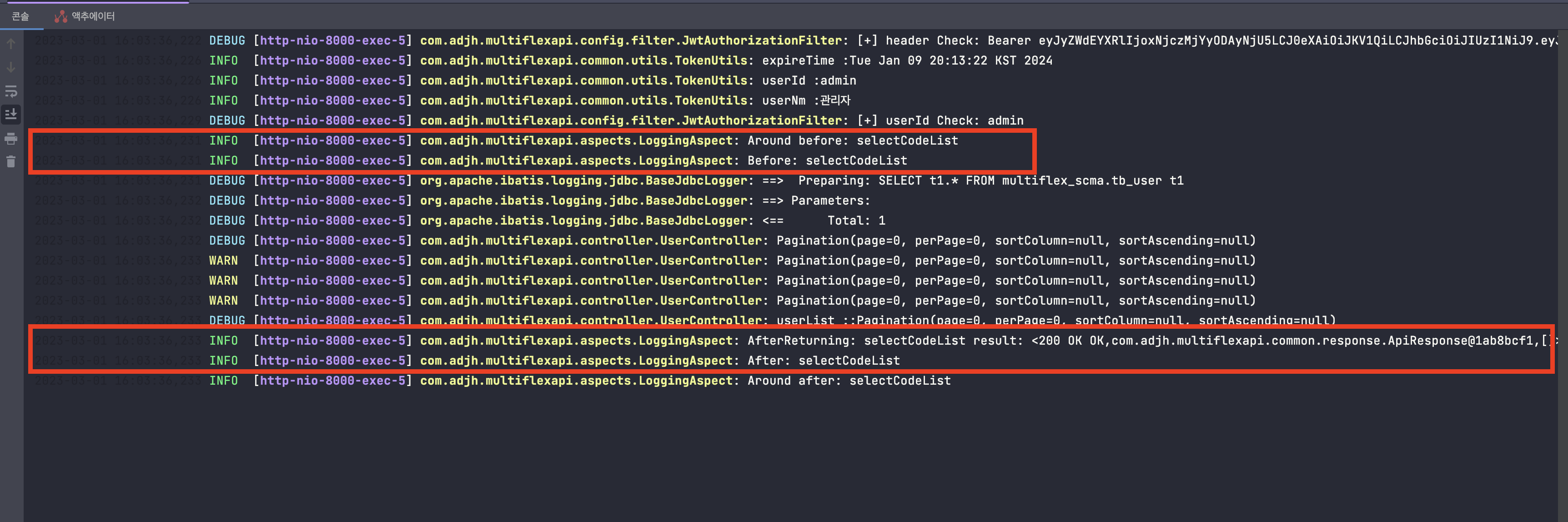 💡 해당 콘솔을 확인하면 총 4번의 구성한 LogginAspect.java 부분에 로깅이 출력되었습니다.