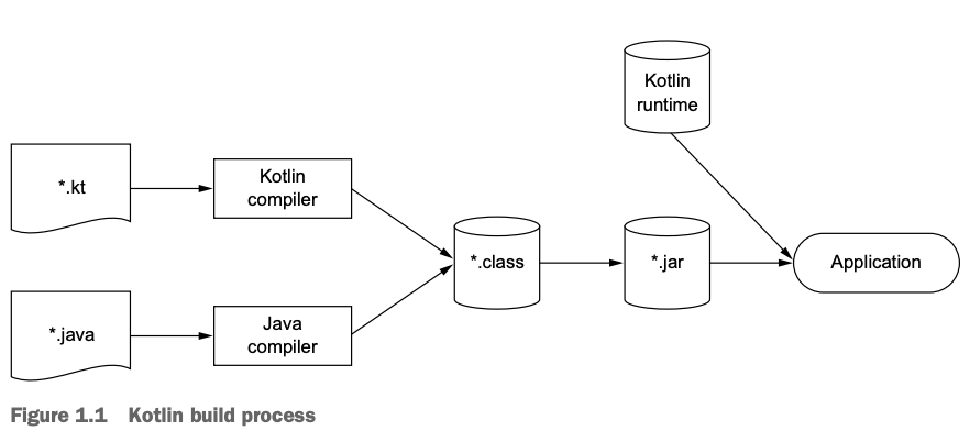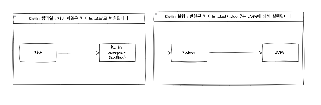 1. *.kt 파일의 소스코드는 Kotlin Complier(kotlinc)를 통해서 컴파일이 됩니다. 2. 컴파일이 수행되면 *. class의 바이트 코드 파일로 생성이 됩니다. 3. 바이트 코드 형태의 파일은 JVM을 통해서 수행이 됩니다.
