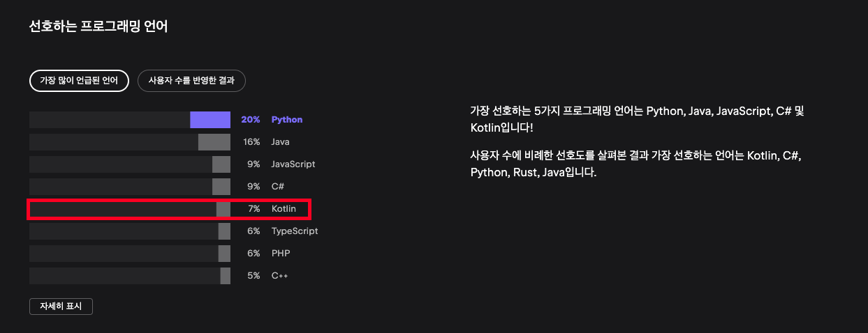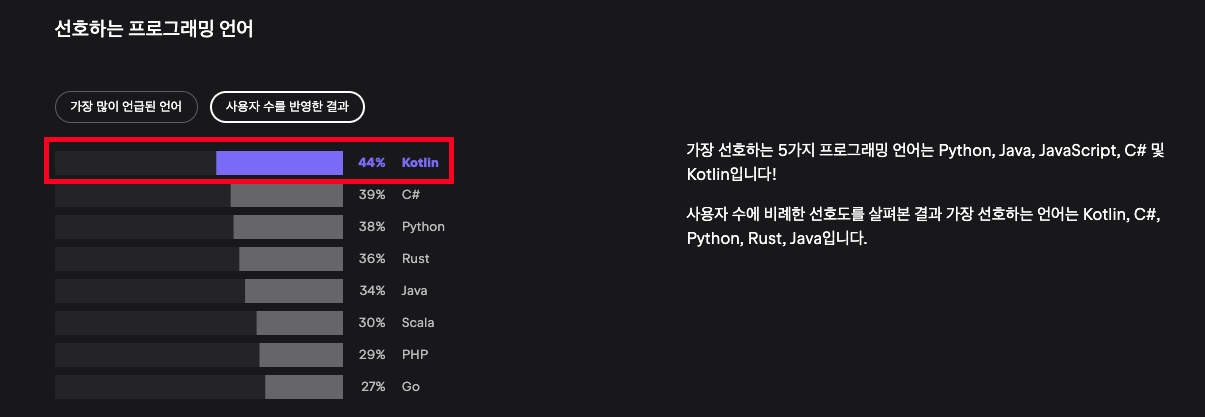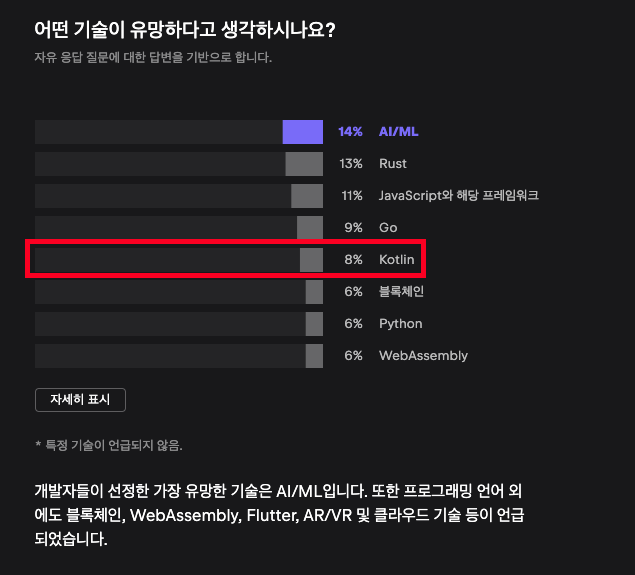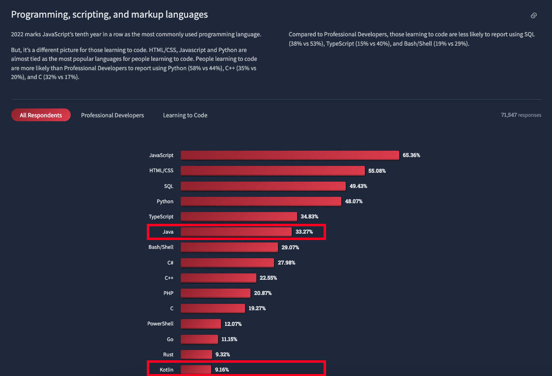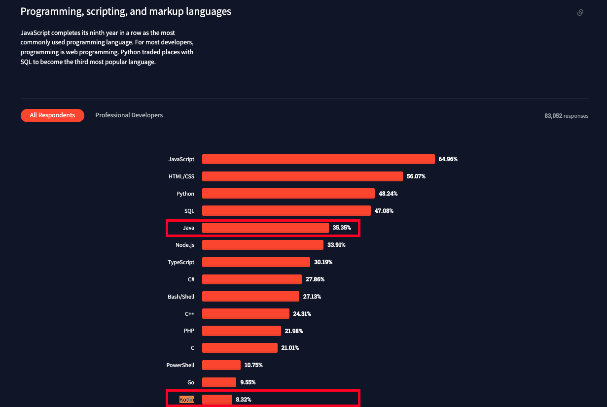 💡 미비한 비교지만 Java의 사용량은 35.35% → 33.27%로 줄었고, Kotlin의 경우 8.32% → 9.16%로 상승하였습니다. (이는 모바일 환경이 아닌 웹 환경만 비교가 된 사항입니다.) 💡 해당 Survey에서는 급격하게 Java 언어를 사용하지 않고 Kotlin을 사용하고 있다라고 이야기할 수 없는 비교 자료이긴 하지만 요즘 개발자들은 어떤 것에 더 관심을 갖는지 확인할 수 있는 자료가 됩니다.