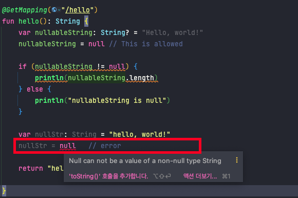 💡 Nullable 타입과 Non-nullable 타입을 구분하여 컴파일러가 NullPointException을 런타임에서 방지할 수 있습니다. 💡 Kotlin은 null에 대해 안정성을 지원하는 언어로 컴파일을 수행할 때 null 참조를 방지하여 런타임 중에 발생할 수 있는 NullPointException을 방지할 수 있습니다. 💡“?” 연산자를 사용하여 변수가 null 일 수 있다는 것을 나타냅니다.