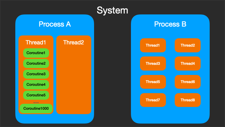 💡 프로세스 내에서 1000개의 스레드를 생성하여 실행하는 경우 많은 CPU 자원을 소비하는 반면에 1000개의 코루틴을 실행하는 경우 적은 CPU 자원을 소비합니다. 💡 코루틴의 경우 하나의 Thread에 수천 개의 코루틴이 수행될 수 있습니다. 코루틴은 Thread 없이는 수행이 불가능 하지만 Thread를 옮겨가면서 수행할 수 있습니다.