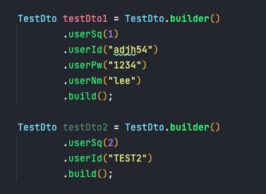 💡 빌더 패턴을 이용하면 하나의 객체의 값들을 구성하고자 할 때 각각의 생성자를 구성하는 것이 아니라 @Builder만 구성하여 객체를 생성할 때 필요한 값만 넣어주고 객체를 구성합니다. 이를 통해 객체 내의 요소값들을 한눈에 확인이 가능하며, 매번 필요에 따라 생성자를 만들어 줄 필요도 없습니다.