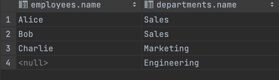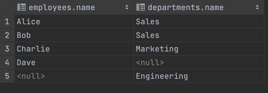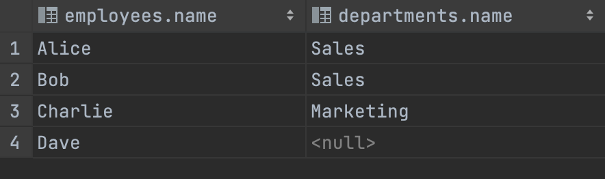 - employees 테이블과 departments 테이블을 ‘UNION ALL' 합니다. - employees의 테이블에서 'name' 컬럼과 departments의 테이블에서 'name' 컬럼의 모든 값을 가져와서 중복을 포함하여 합칩니다.