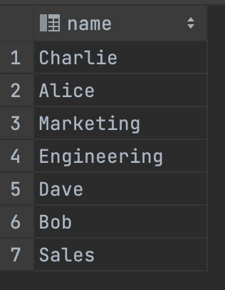 - employees 테이블과 departments 테이블을 ‘UNION' 합니다. - employees의 테이블에서 'name' 컬럼과 departments의 테이블에서 'name' 컬럼의 모든 값을 가져와서 중복을 제거하고 합칩니다.