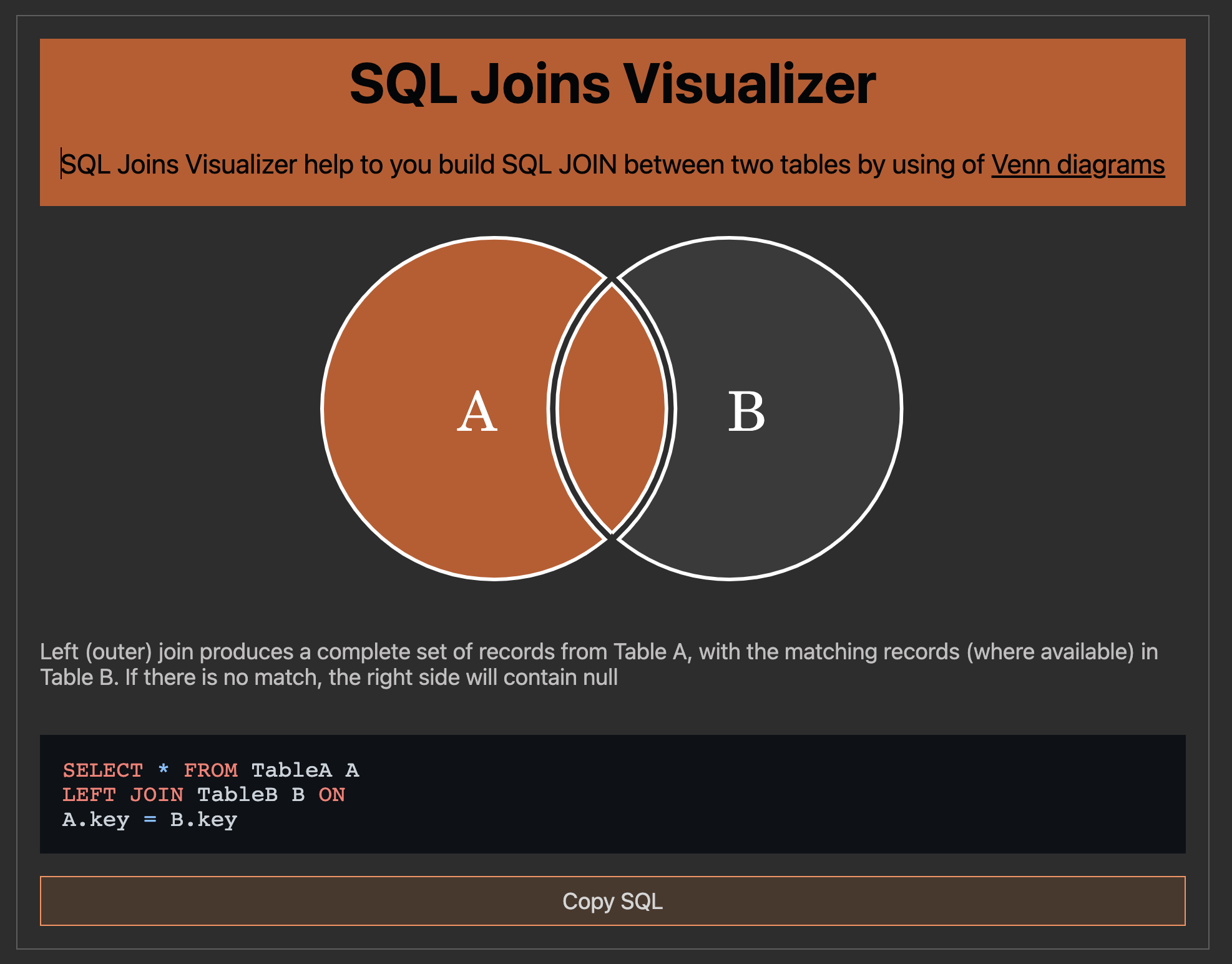 - ’왼쪽 테이블의 모든 행’과 ‘오른쪽 테이블에서 왼쪽 테이블과 공통된 값’을 가지고 있는 행들을 반환합니다. - 만약 오른쪽 테이블에서 공통된 값을 가지고 있는 행이 없다면 NULL 값을 반환합니다.