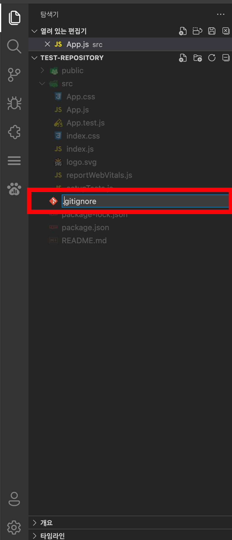 2. [VSCode] 파일 이름을 ‘.gitignore’라고 지정된 이름으로 생성하면 완료가 됩니다.