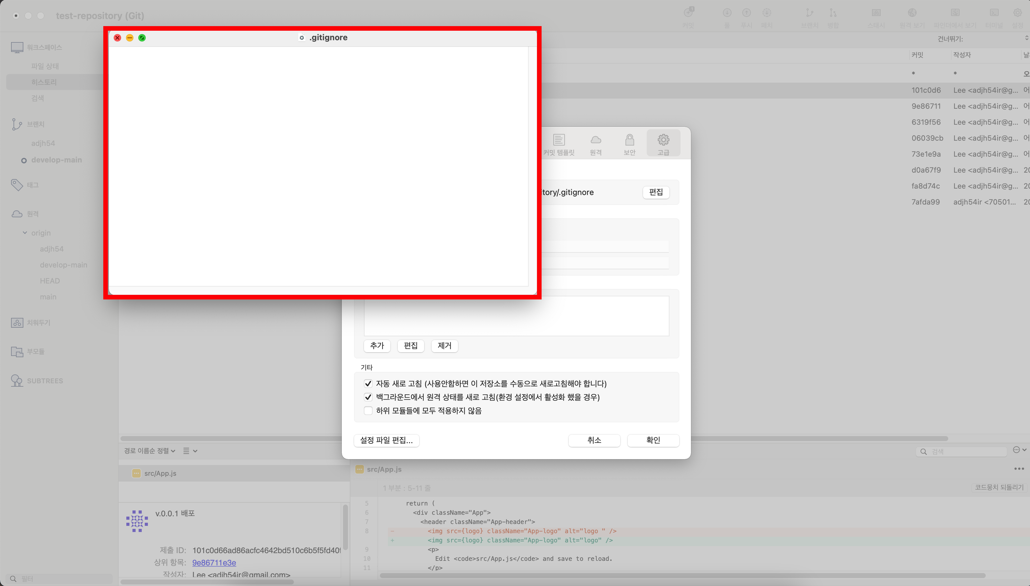 해당 팝업이 뜨고, 새롭게 .gitignore 파일이 생성되며, 편집도 가능하다