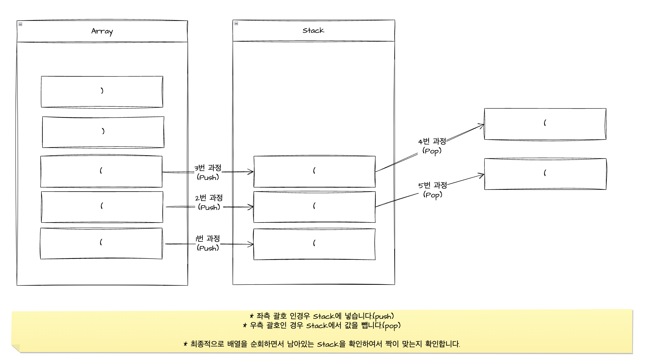💡 해당 방법에서는 Stack을 이용하여서 “좌측 괄호” 일 경우 Stack에 넣어두고 우측 괄호가 나오면 Stack에 저장되어 있는 좌측 괄호 값을 빼는 형태로 짝을 찾아가는 형태로 구성합니다.