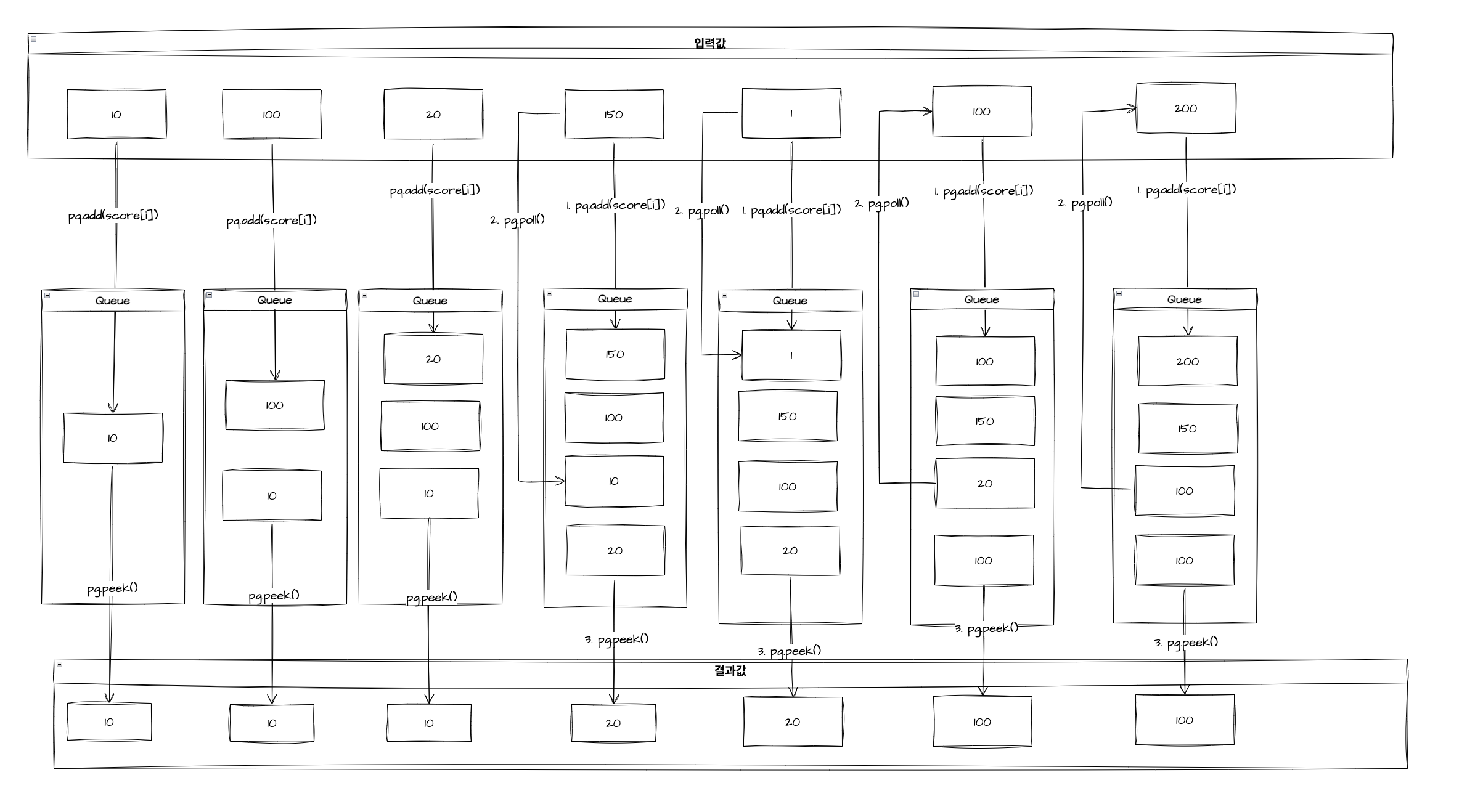 1. 우선순위 큐를 생성하고 값을 넣습니다. 2. 우선순위 큐가 비워질 때까지 반복합니다. 큐를 순회합니다(* 해당 순회를 하면 기존의 배열의 값들을 순차적으로 반환합니다) 3. 순차적인 배열과 우선순위 큐의 가장 높은 경우(pg.peek)를 찾아서 비교합니다. 4. 우선순위 큐에서는 최상위 값( 가장 높은 우선순위 인경우)을 제거합니다. 5. 큐와 위치가 같으면 큐를 초기화하고 멈춥니다.