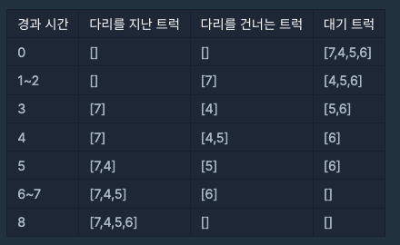 - 예를 들어, 트럭 2대가 올라갈 수 있고 무게를 10kg까지 견디는 다리가 있습니다. 무게가 [7, 4, 5, 6]kg인 트럭이 순서대로 최단 시간 안에 다리를 건너려면 다음과 같이 건너야 합니다.