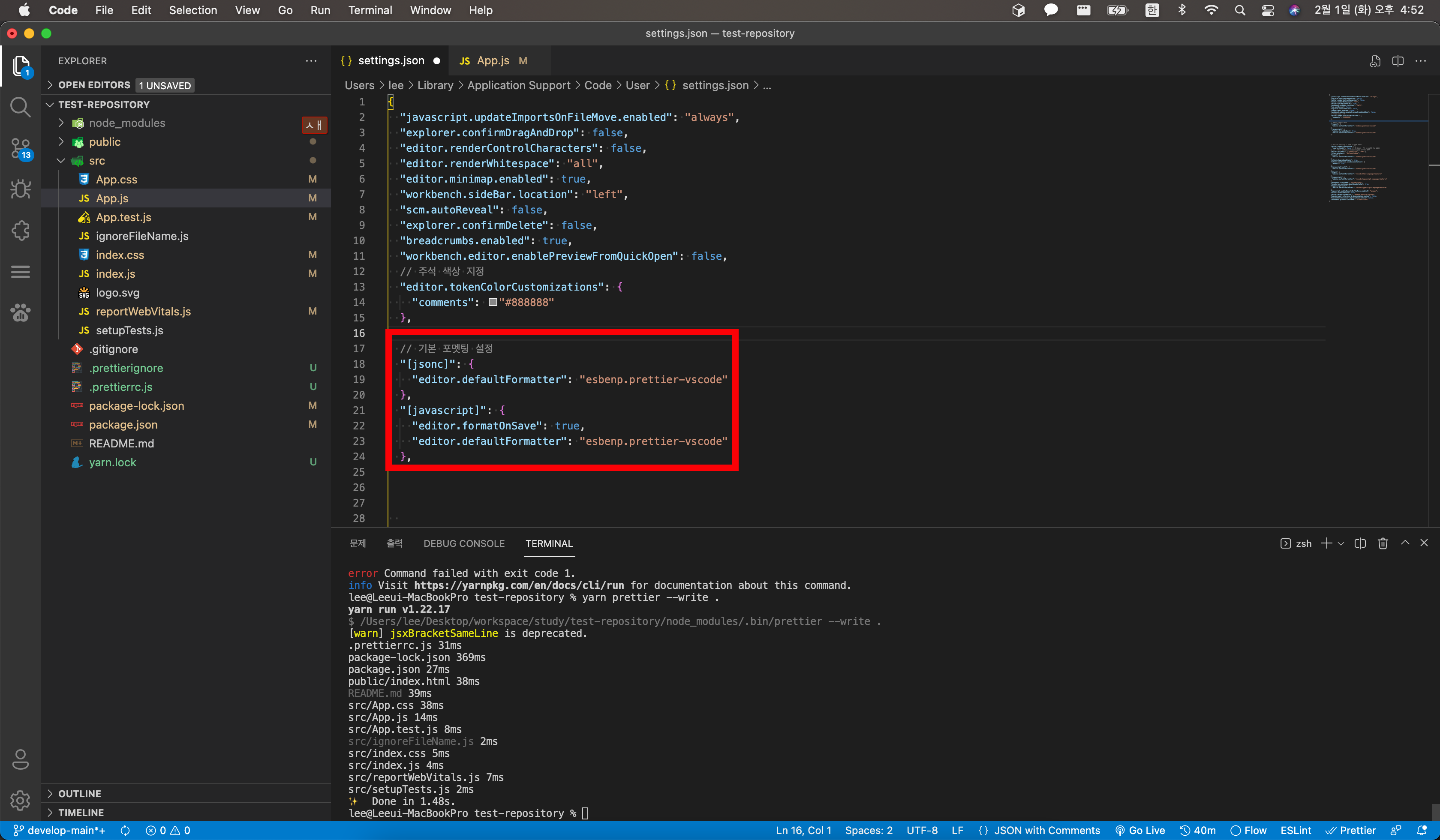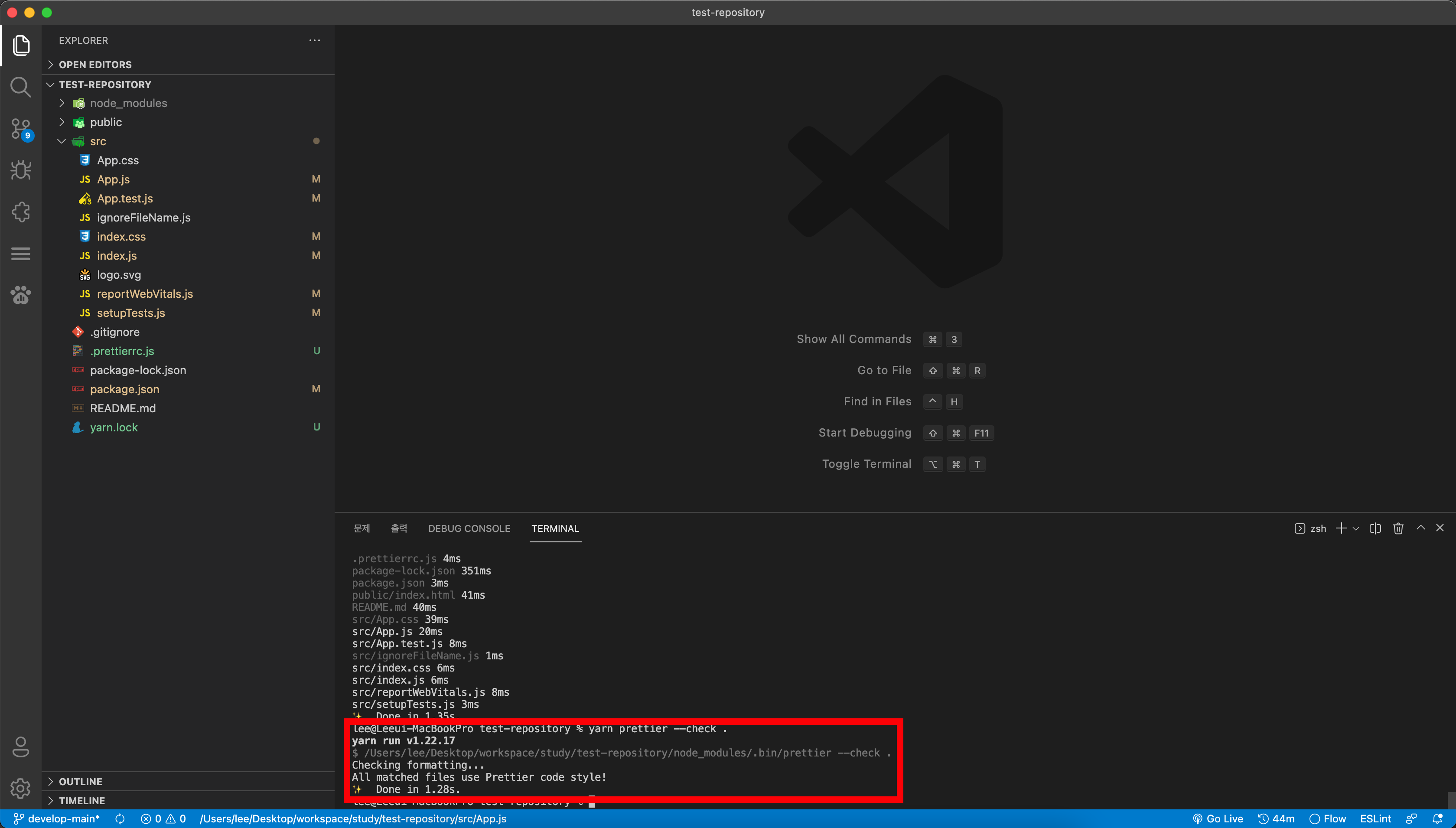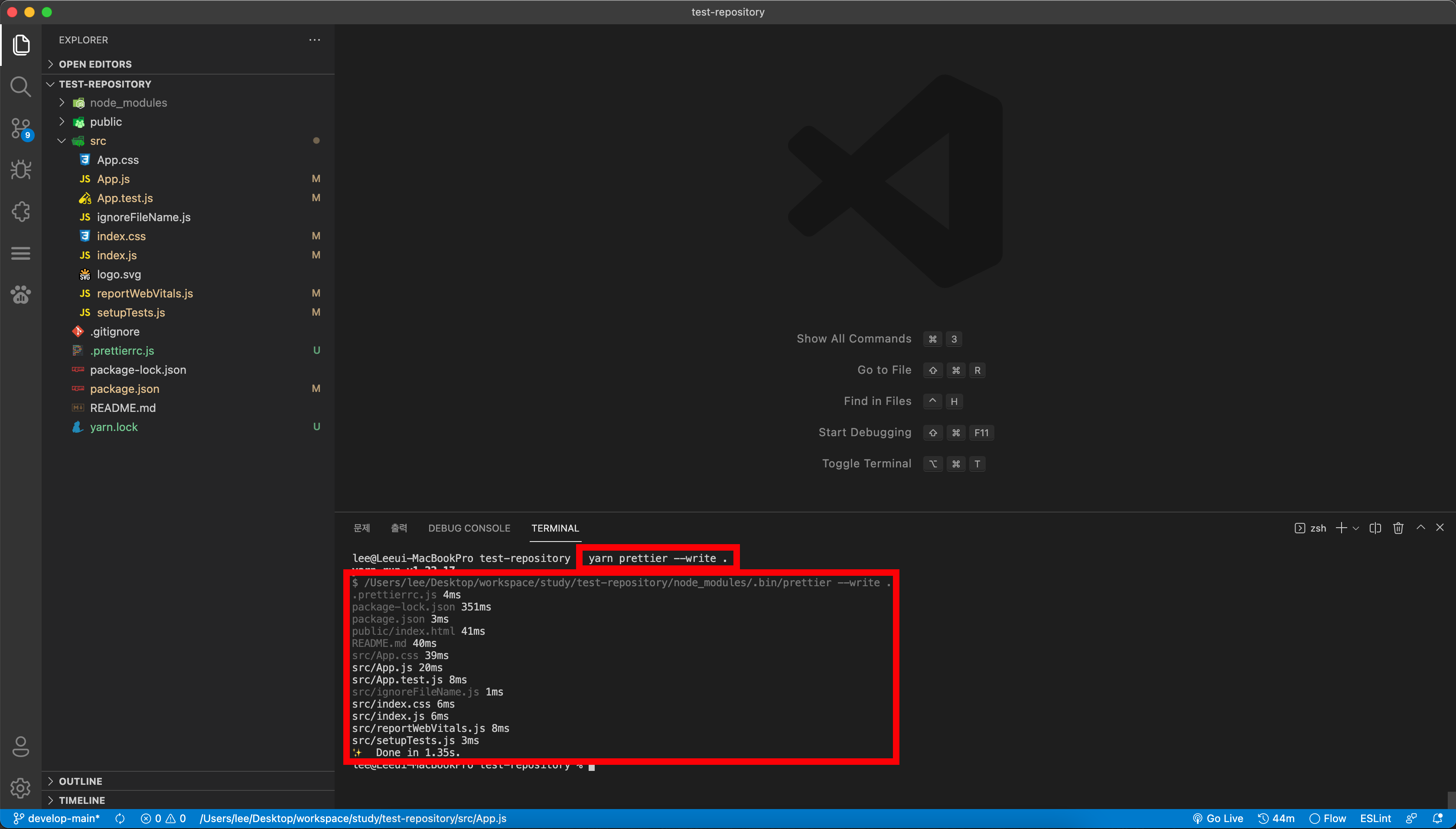💡 하단의 명령어를 커멘드에서 입력하면 Prettier를 지정한 옵션에 따라 적용하도록 처리가 됩니다.