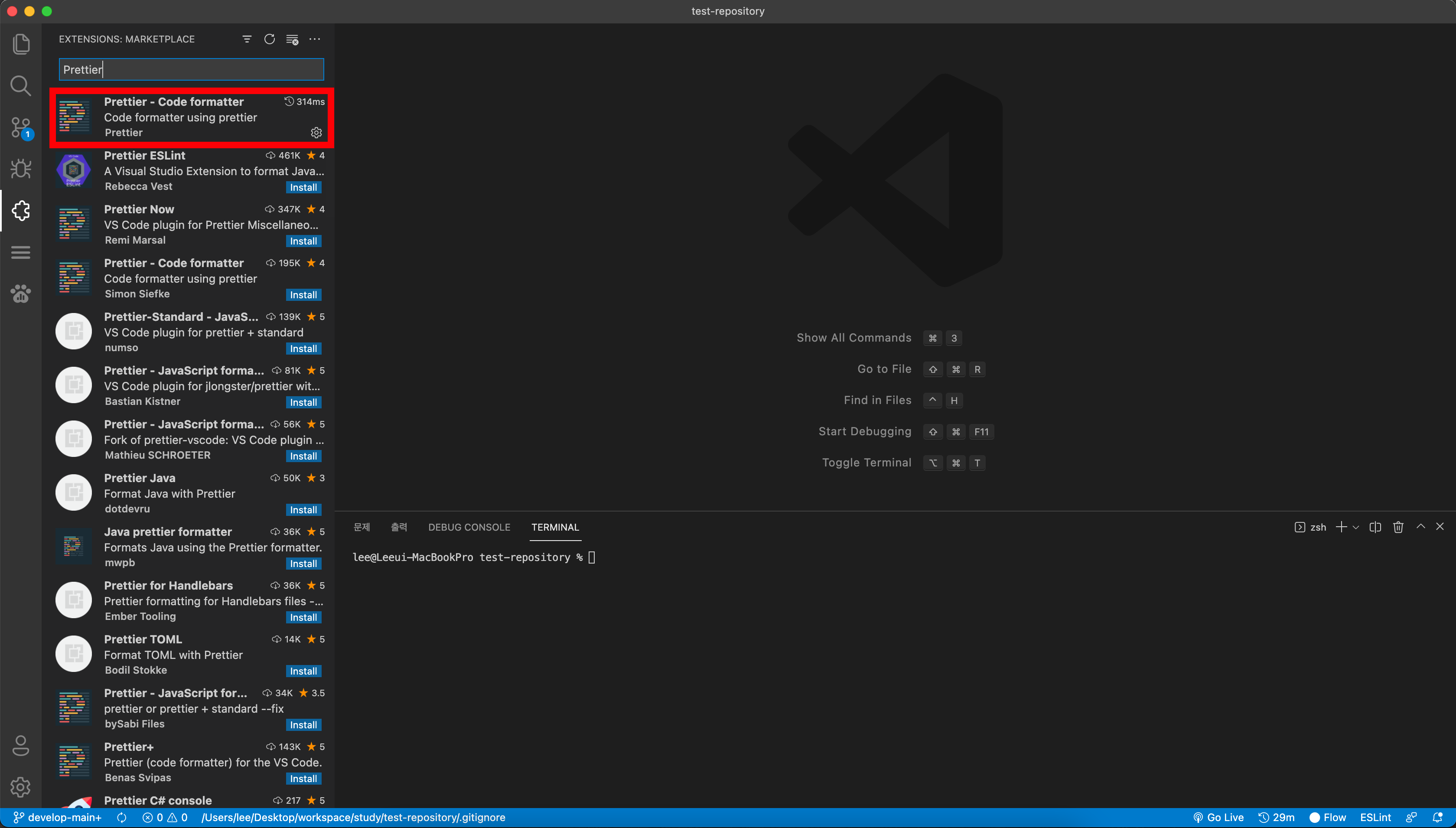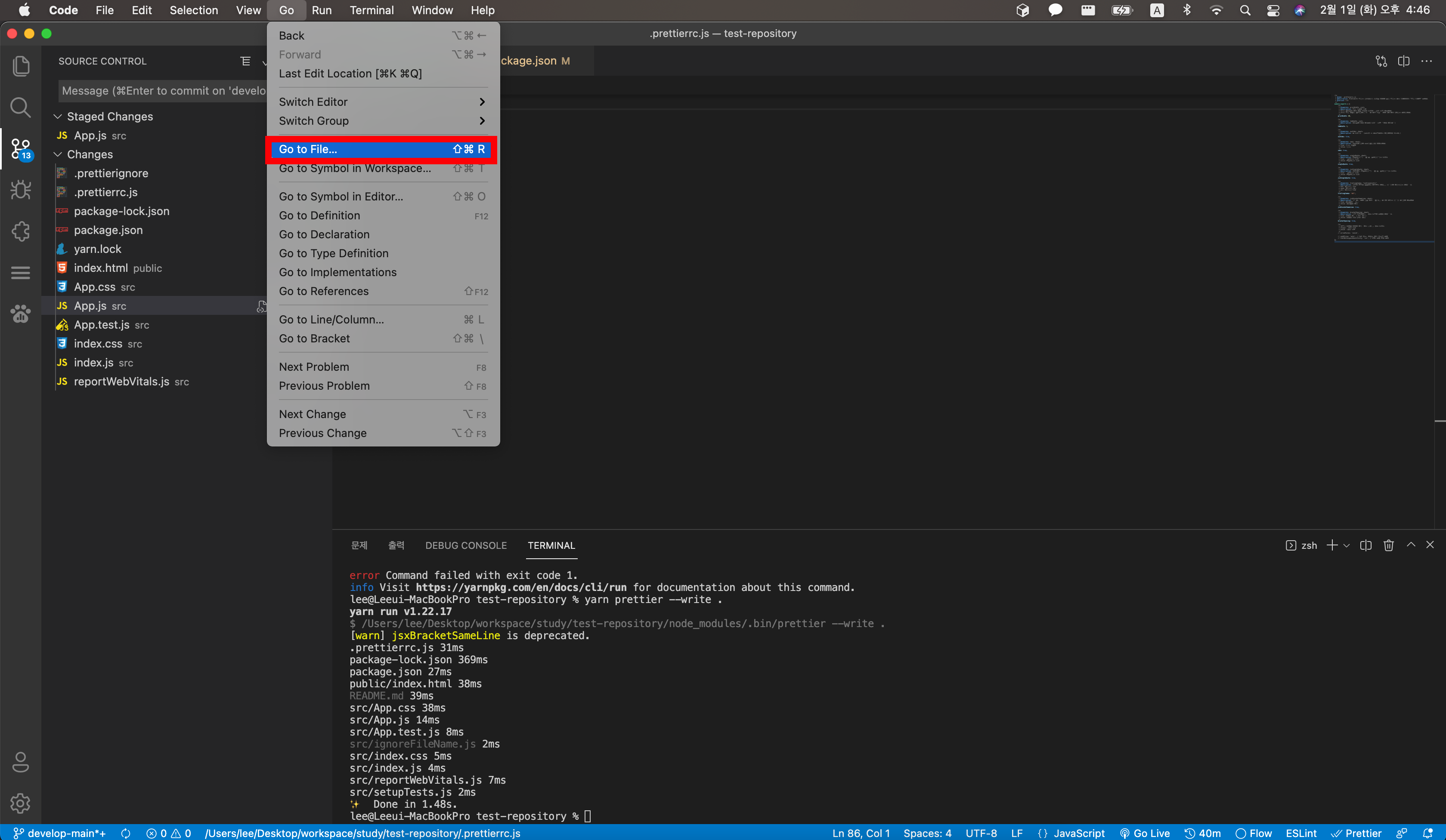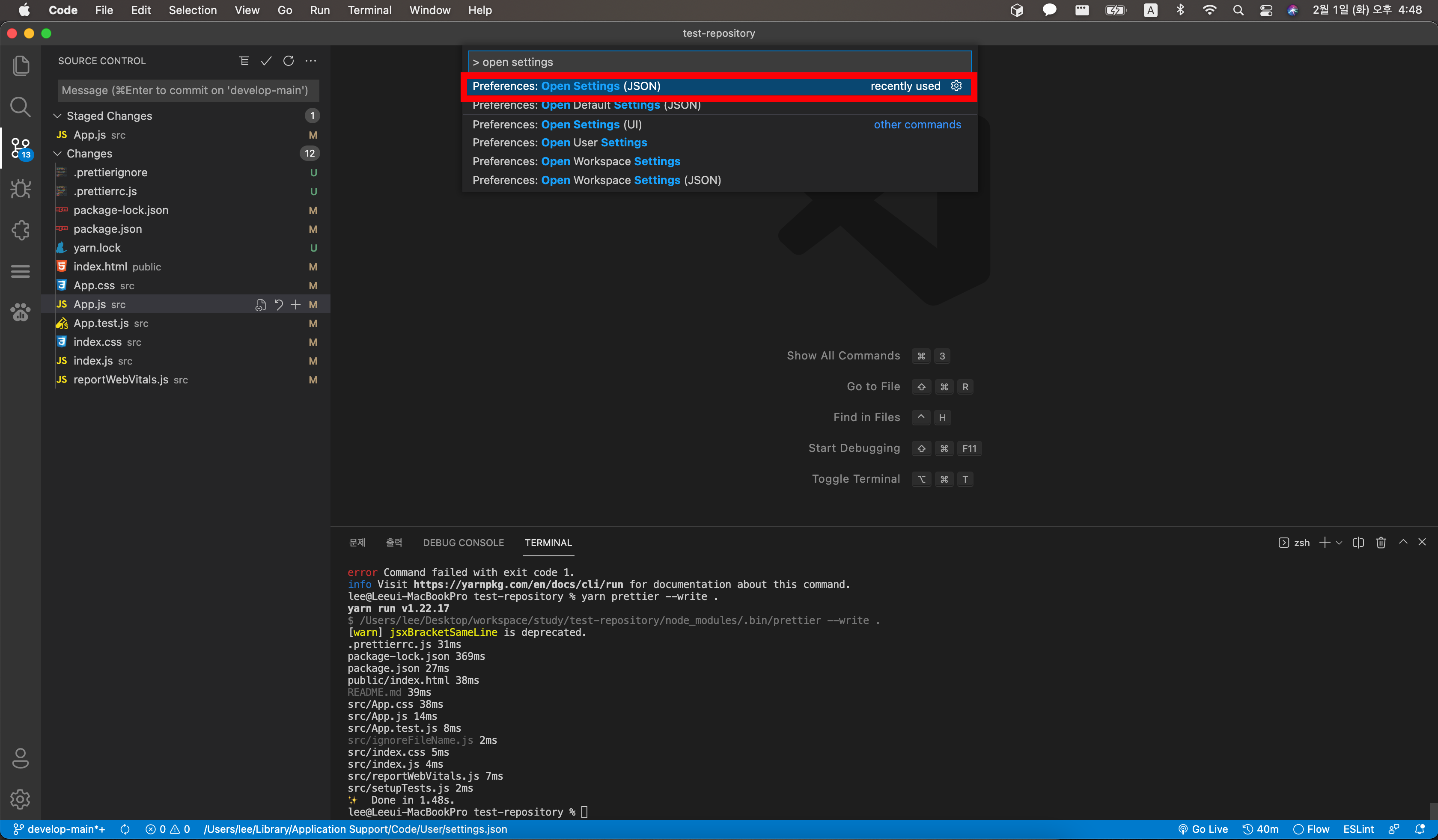 💡 하단의 명령어를 커멘드에서 입력하면 Prettier를 지정한 옵션에 따라 적용하도록 처리가 됩니다.