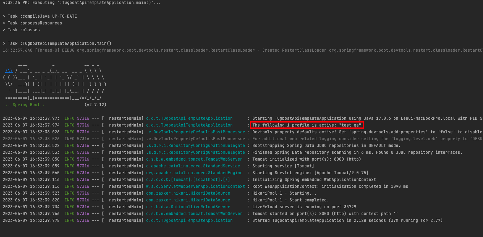 💡 해당 properties 파일 내에서 spring.profiles.active 속성을 통해서 값을 지정하면 Spring Boot 애플리케이션의 프로파일을 활성하는 데 사용합니다.