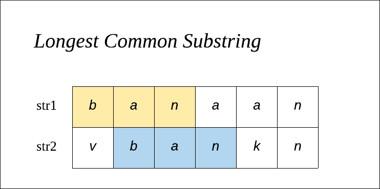 - 최장 공통 문자열은 두개의 문자열 내에서 ‘연속적인 부분 문자열’ 중 가장 긴 길이의 공통 부분 문자열을 찾습니다. (* 해당 경우는 연속되는 문자열인 경우 포함됩니다)