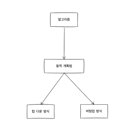 - 탑 다운 방식은 작은 부문 문제를 ‘재귀적인 호출’을 이용하여서 해결하는 방식입니다.바텀업 방식은 작은 부분 문제부터 시작하여 ‘반복문’을 통해 해를 계산하고 저장해둔 뒤 이전에 계산 문제의 해를 점점 더 큰 문제로 해결하는 방식입니다.