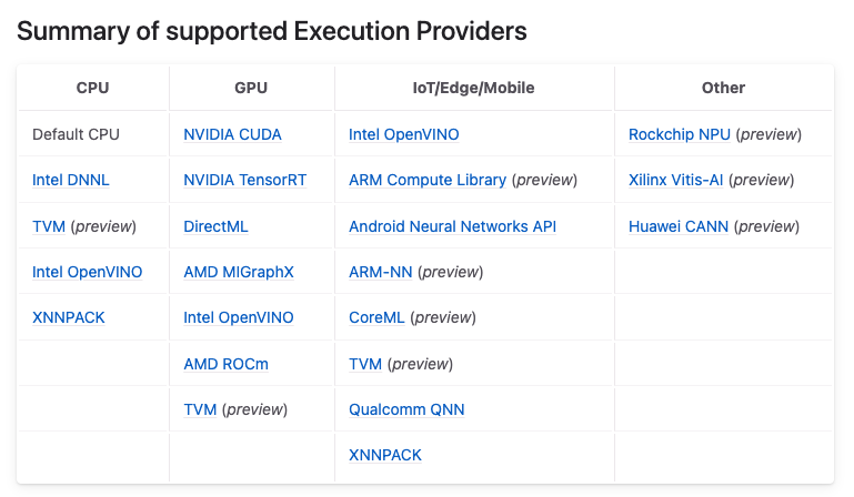 - 또한, ONNX Runtime은 CPU, GPU 및 딥러닝 가속기(DNNL, NNAPI, OpenVINO)를 지원합니다.