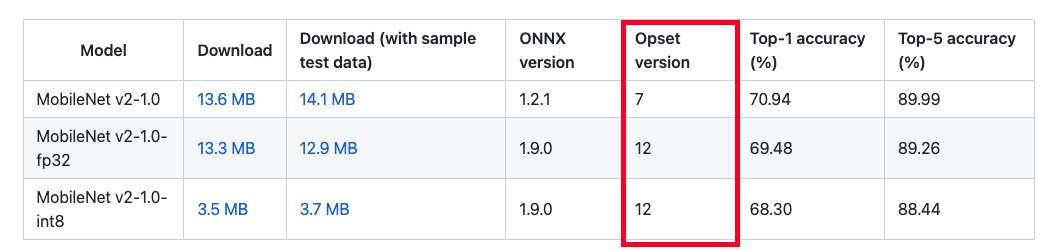 💡 공식사이트에서 제공해 주는 모델들을 확인하면 ‘Opset(Operator Sets) Version’이 있는 것을 확인할 수 있습니다.