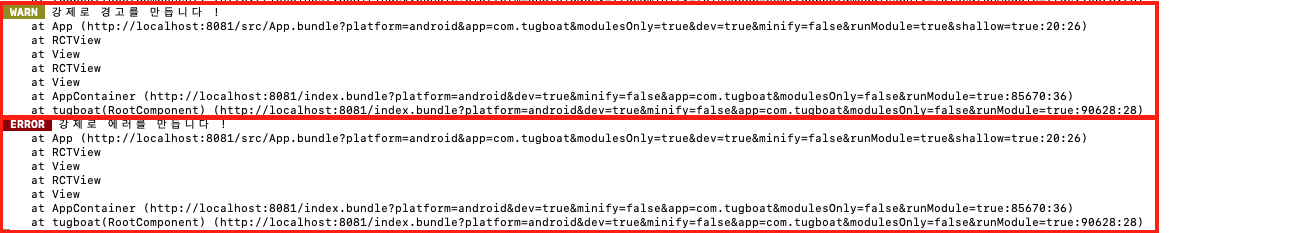 💡 console.warn(), console.error()로 로그를 출력하였지만 LogBox 내에 이를 무시하여서 출력에는 제외가 되었습니다.