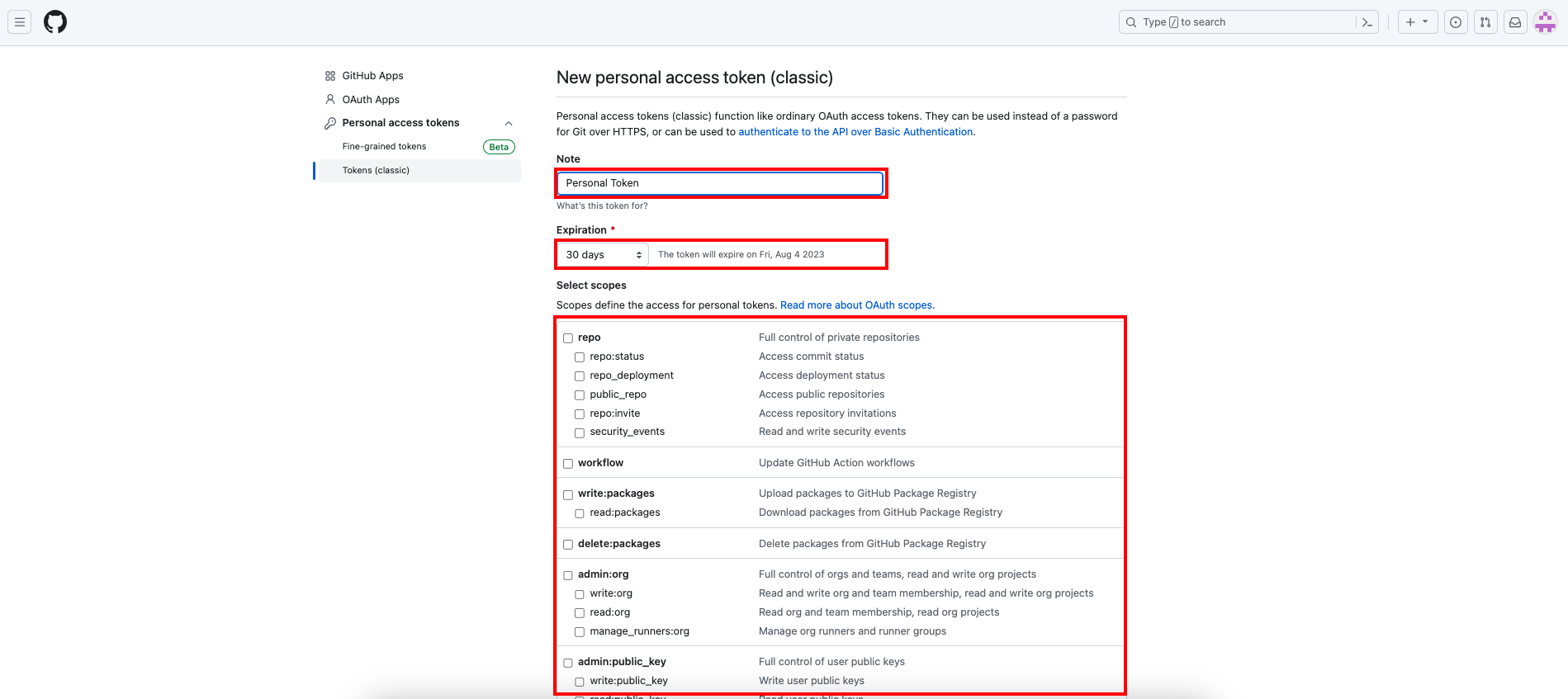3) Github 토큰을 발급받습니다.