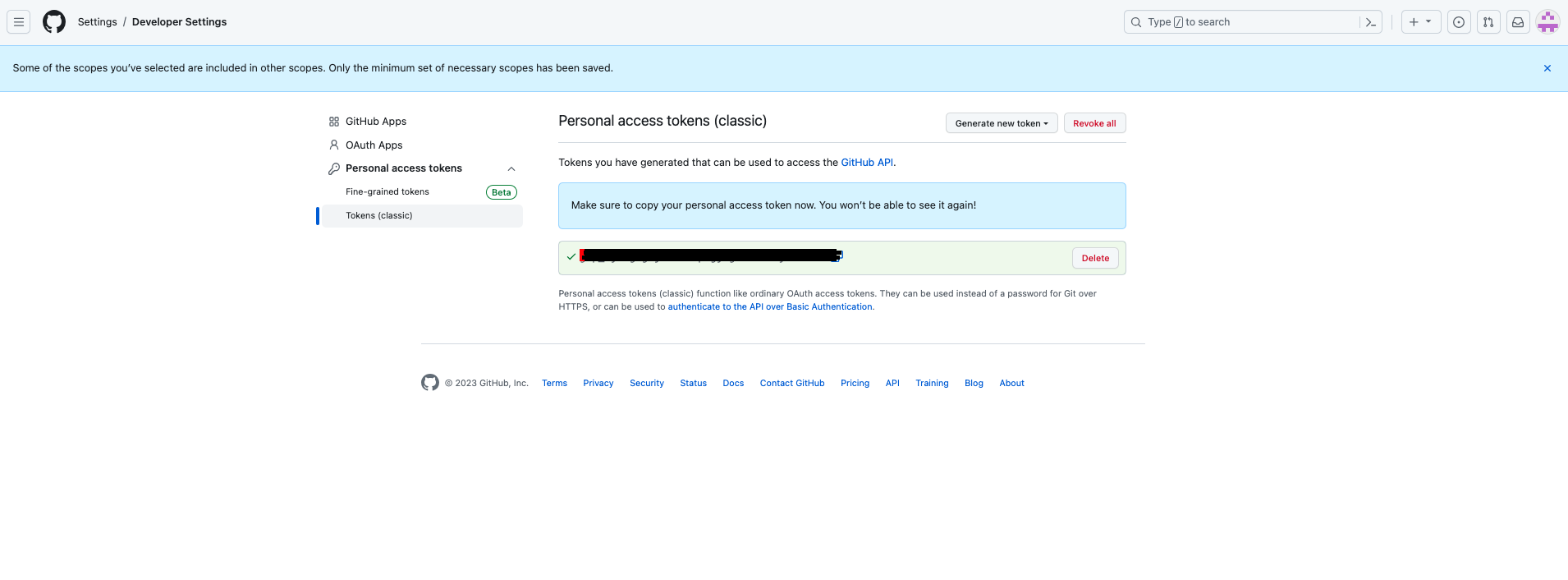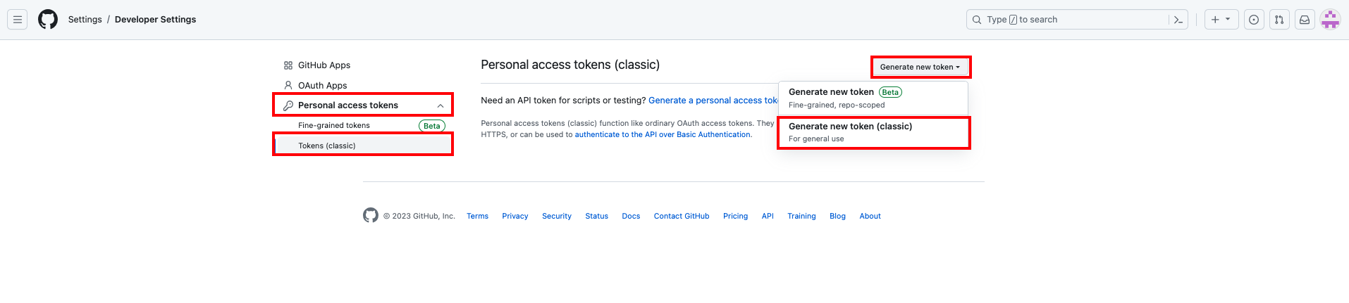 💡 Personal access tokens - Tokens(classic) - Generate new token - Generate new token(classic) 버튼을 누릅니다