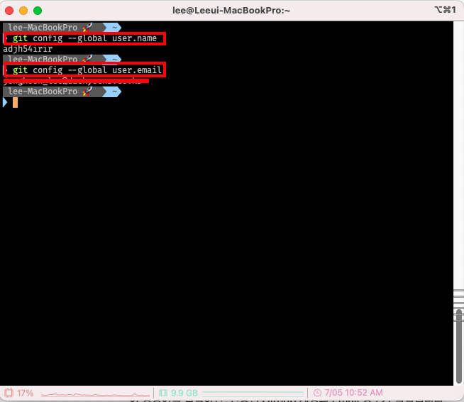 💡 변경하려는 계정의 이름(username)과 이메일을 로컬 터미널에서 변경합니다.