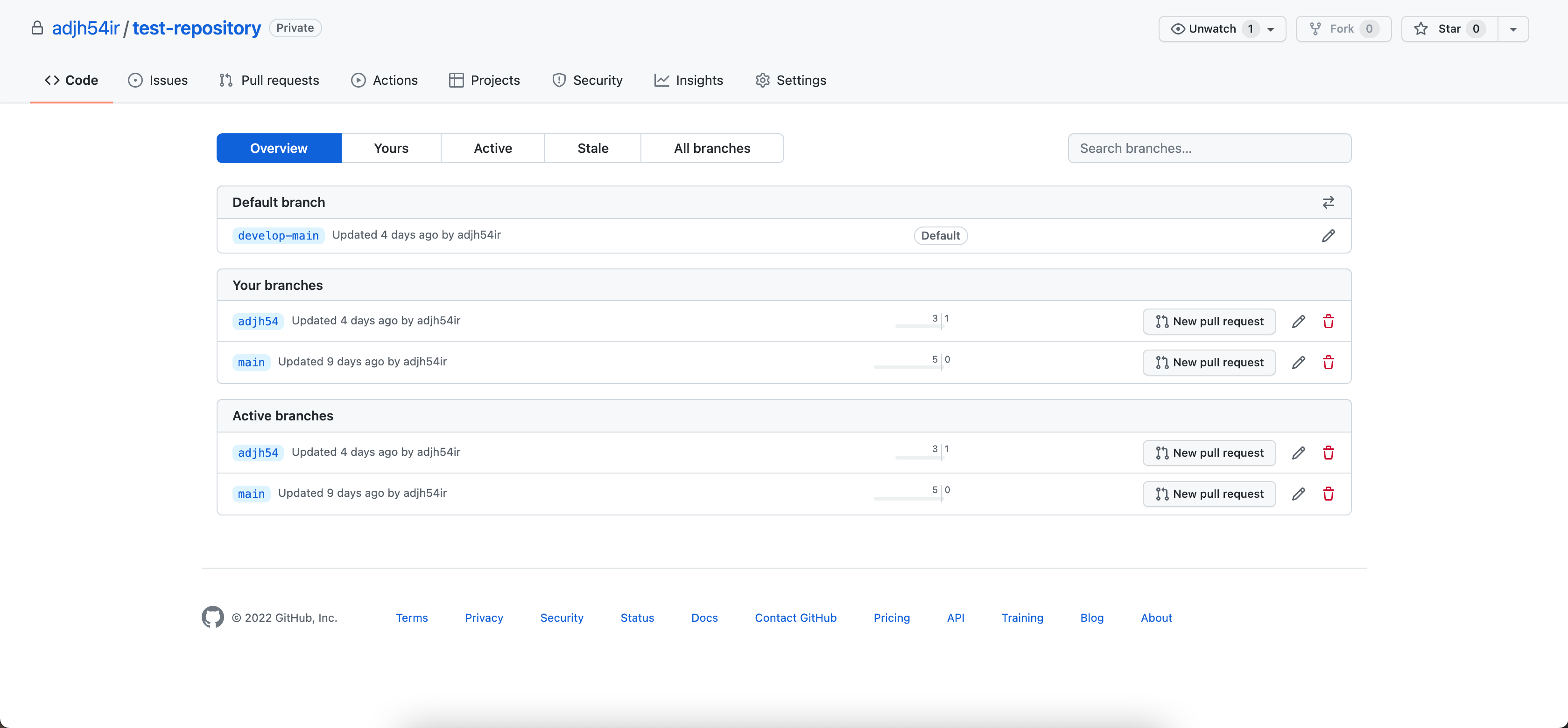 2. 그러면 아래와 같이 Default branch와 내 소유 혹은 활성화된 브런치 정보를 확인할 수 있다.