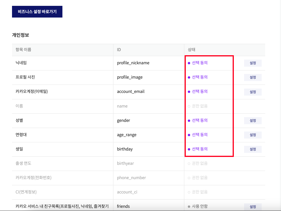 💡카카오톡 로그인을 수행할 때 사용자에게 요구할 정보들에 대해서 설정합니다.