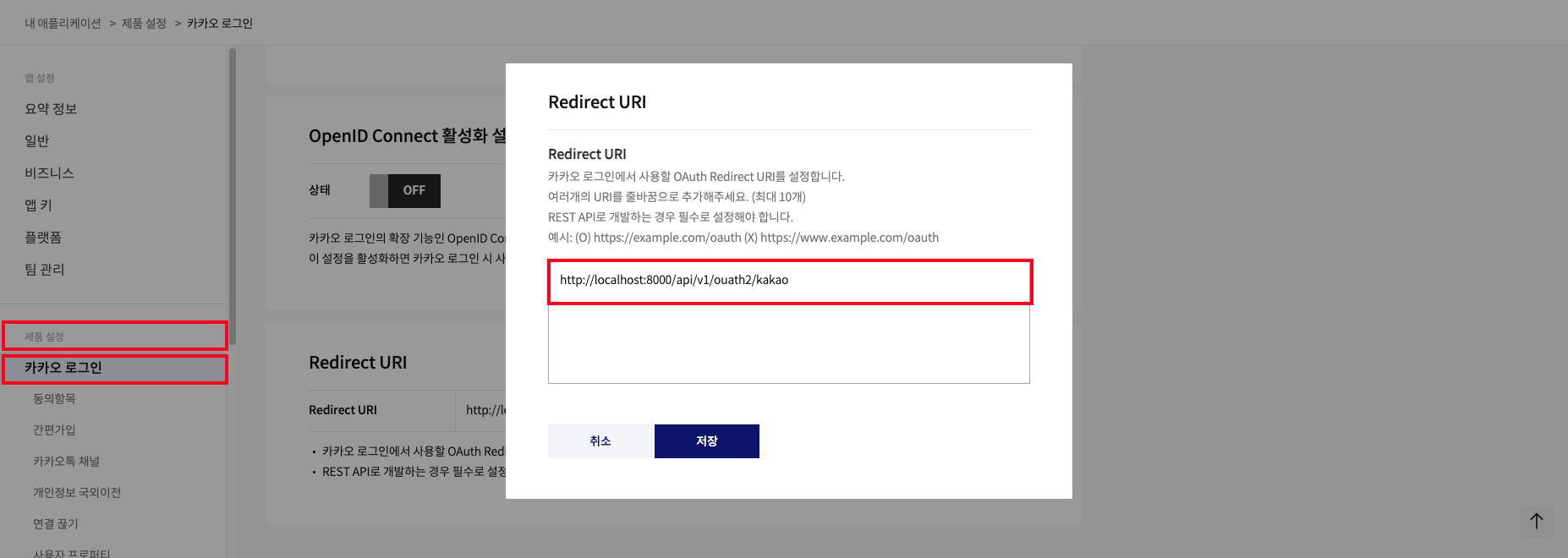 💡 '제품 설명 > 카카오 로그인 > Redirect URI > 페이지'를 입력하고 저장합니다.