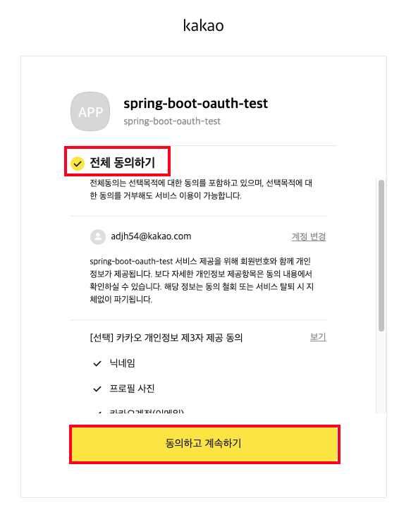 7. 카카오톡 로그인을 통해서 가져올 정보에 대해서 선택합니다.