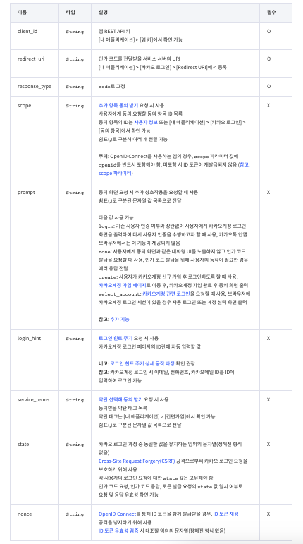 | 인가코드 발급 | GET | https://kauth.kakao.com/oauth/authorize | client_id redirect_uri response_type |