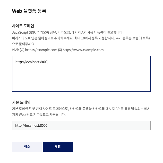 💡 '앱 설정 탭 > 플랫폼 > Web > Web 플랫폼 등록' 버튼을 누릅니다.