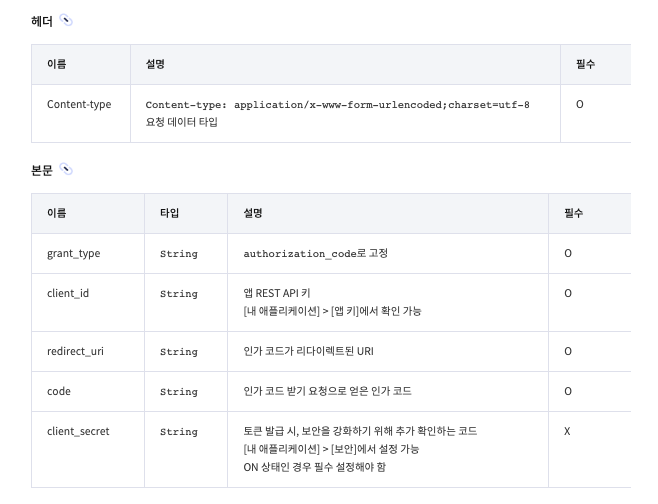 | 토큰 발급 | POST | https://kauth.kakao.com/oauth/token | grant_type client_id redirect_uri code |
