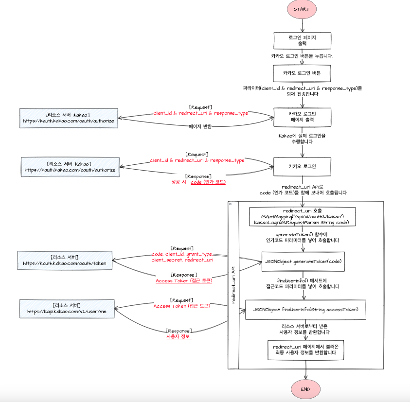 💡 해당 부분에서는 아래의 과정을 통해 최종적으로 카카오톡 로그인을 통해 사용자 정보를 조회하는 과정으로 구성을 하였습니다.