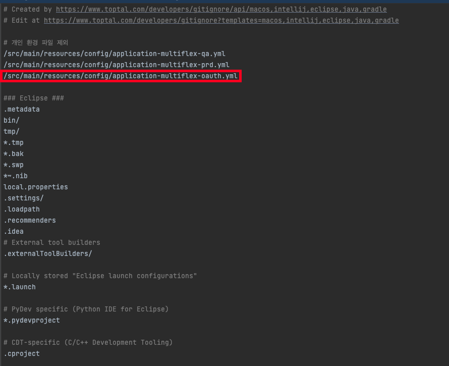 💡 중요한 정보가 git에 올라가지 않도록 gitignore내에 키 값과 secret정보가 들어간 application-multiflex-oauth 파일을 추가합니다.