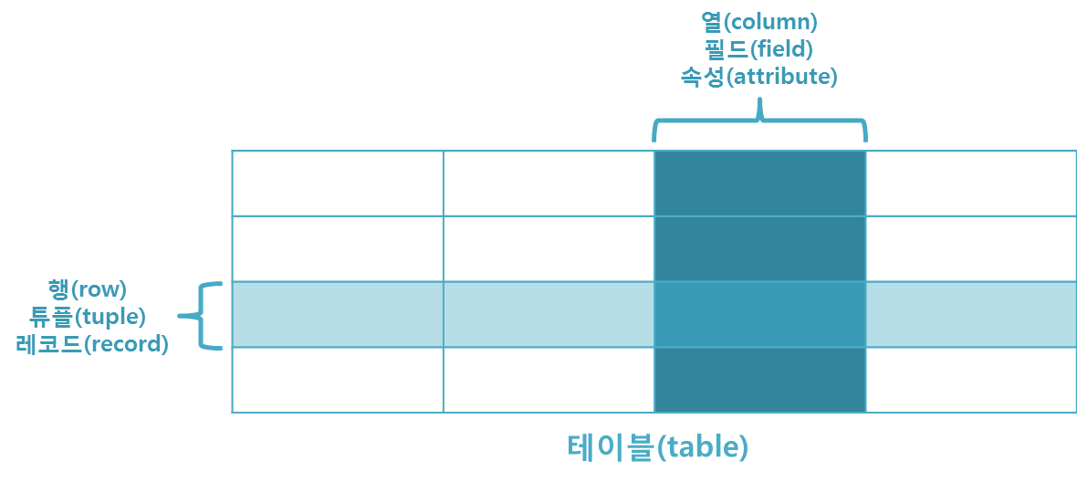 | 속성(Attribute) | 필드와 동일한 의미로 사용되며, 열(Column)을 구성하는 하나의 세부 항목을 의미합니다. |