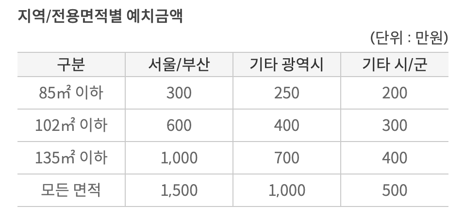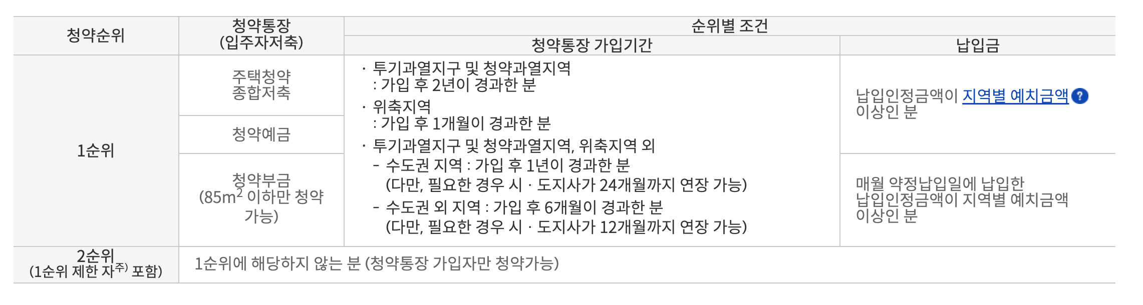 💡 해당 순위에 만족하기 위해서는 청약을 하려는 지역과 주택 면적별 예치금이 충족되어야 합니다.