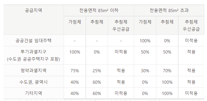 💡 민영주택의 아래와 같이 가점 추첨제로 나누어집니다. 각각 전용면적에 따라서 85㎡이하(25.7평)와 85㎡초과(25.7평)에 따라서 또한 구분이 됩니다.