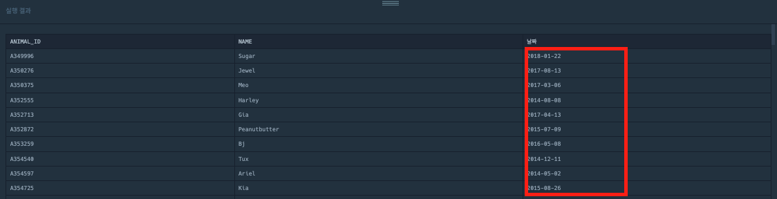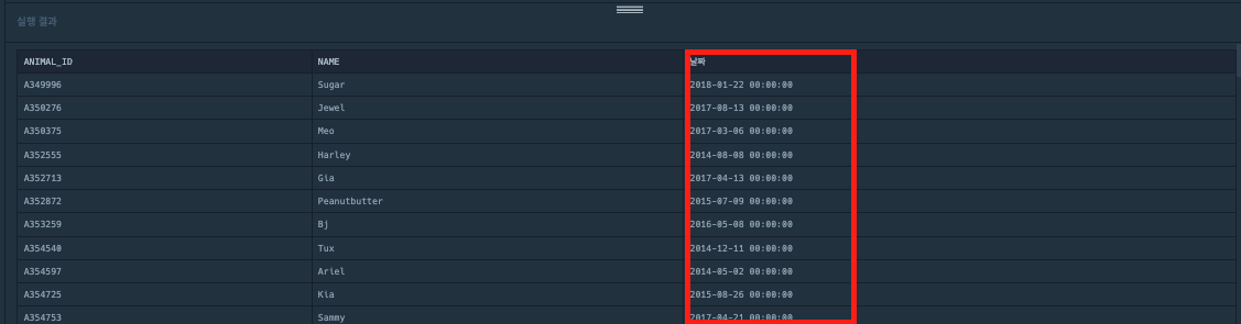 💡 아래의 SQL문은 동물 보호소(ANIMAL_INS) 테이블에서 DATETIME이라는 컬럼의 데이터를 지정된 형태의 DATE 타입으로 변환하는 SQL문입니다.