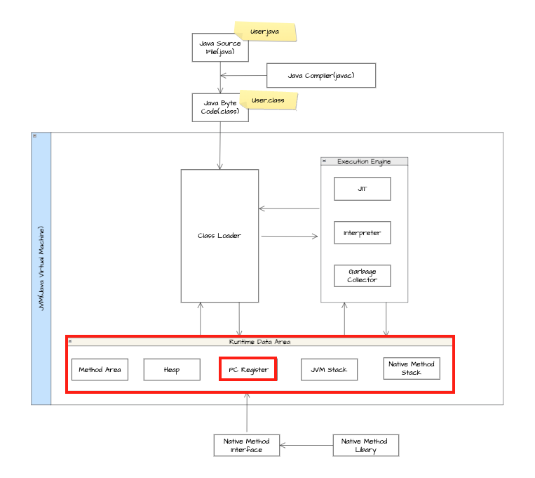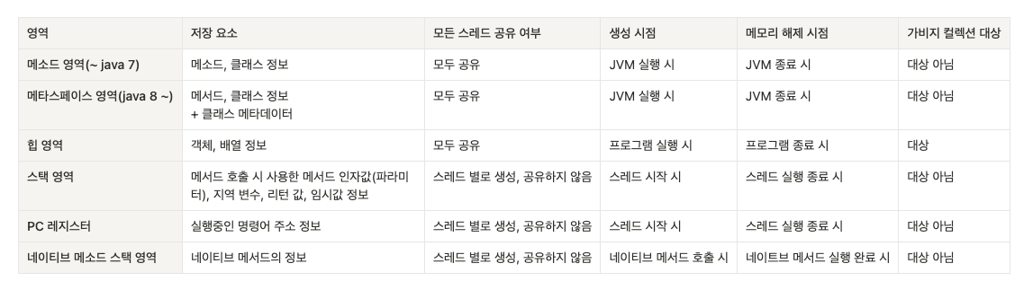 💡 PC 레지스터(PC Register) - JVM의 메모리 영역 중 하나로 각 스레드마다 현재 ‘실행 중인 명령어의 주소’를 저장하는 메모리 공간을 의미합니다.