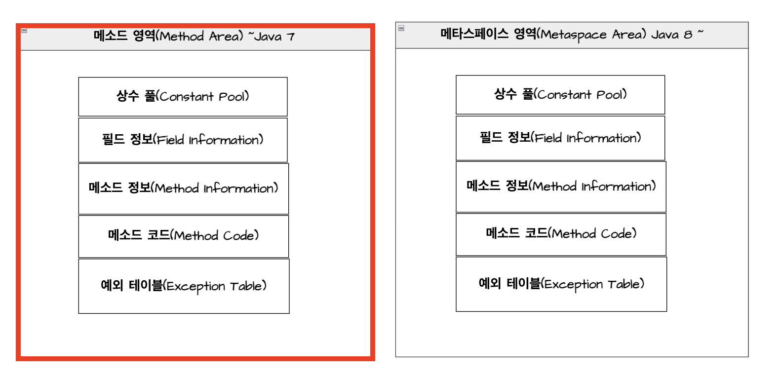 - 메서드 영역은 메서드의 바이트 코드뿐만 아니라 클래스와 인터페이스의 ‘메타데이터도 저장’하게 되었습니다.