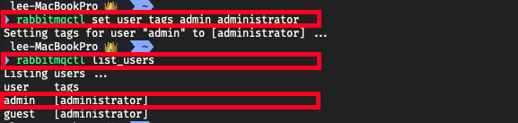 | rabbitmqctl set_user_tags | 사용자 태그 설정 | rabbitmqctl set_user_tags <username> <tag> |